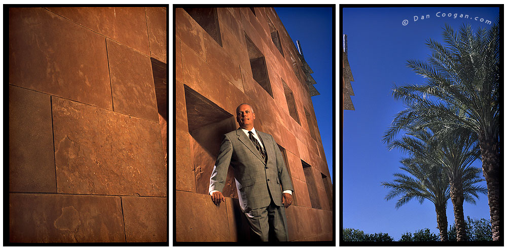 Peter Simonsen Andrew Danish, the art director Cisco Systems iQ magazine asked for an environmental portrait of Peter Simonsen. This was a cover story for the July/August 2003 issue. One of the single images ran on the cover and this triptych ran across 2 pages inside. When I scouted the location, I found this impressive wall and knew immediately that we would shoot here. When we started setting up the lighting, the sun was actually coming through the open wall space so I wanted to keep that look. The option was to open the ambient exposure (shutter speed) or set up a strobe to replicate the look of the sun... of course the sun keeps moving, so the strobe gives us a consistent look for each exposure. Also, if I opened up the shutter speed, then the sky, trees, and the metal fixture at the top of the wall would get lighter in exposure and I didn't want that to happen. Strobist info / Lighting: four Dynalites Nikon 35-70mm lens, 81B filter |