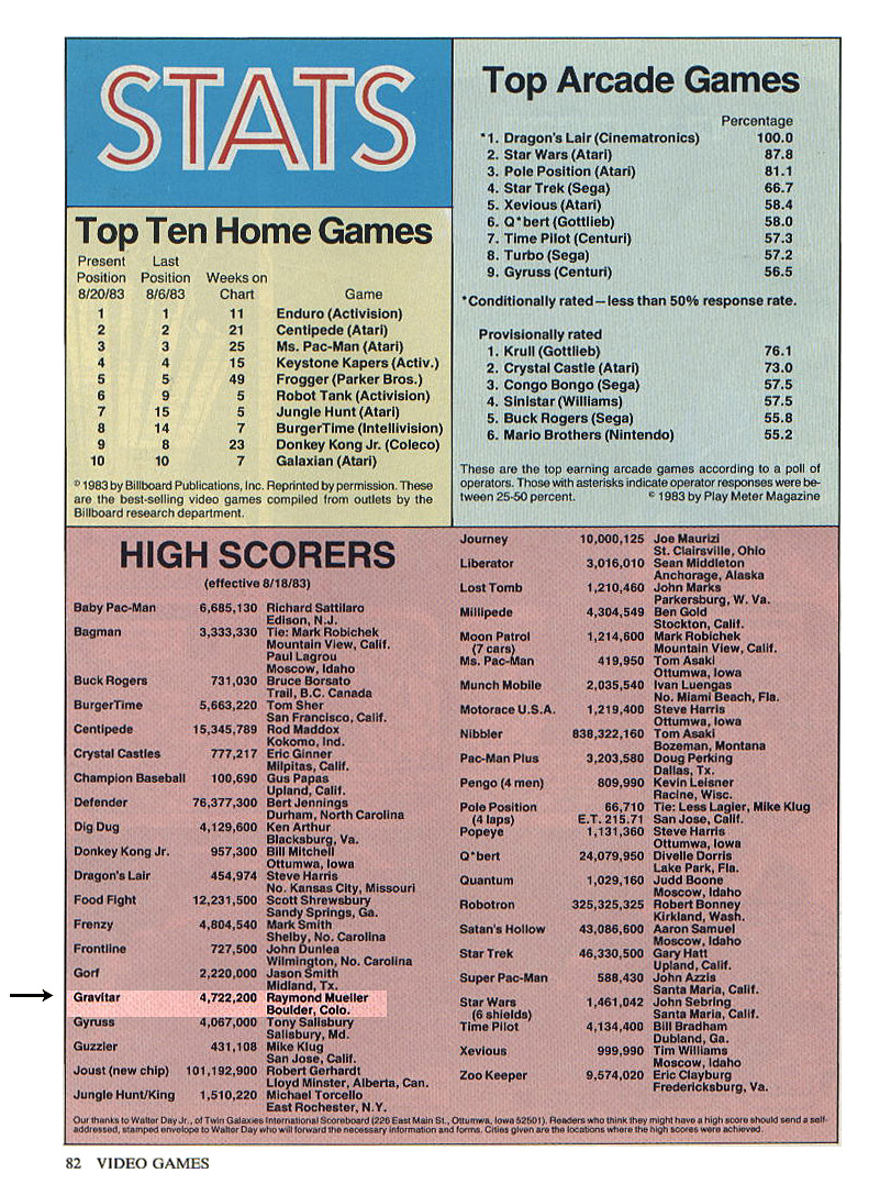 I originally posted this page about Ray Mueller because I wondered who held the world record for Gravitar. Once I found out, I tried for 3+ years to top his amazing score, and I finally did -- but that does not take anything away from what he accomplished in Dec. 1982. He played for more than 12 hours at a Chuck E. Cheese.
