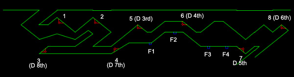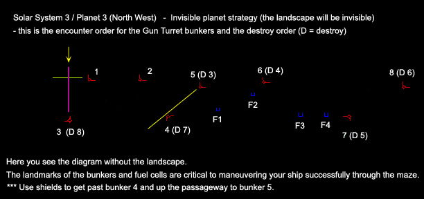 INFORMATION FOR THE: Invisible Landscape strategy - including diagrams Congratulations -- if you made it this far, you have learned to control your ship ** (or so you think -- get ready for the 2 invisible landscapes -- Positive Gravity and Reverse Gravity). After playing many, many games of Gravitar, I have figured out a pretty good strategy (which obviously works great, or I wouldn't be posting this information) to complete the upper left planet (the North West planet) in the 3rd Solar System / Invisible Landscapes. Of course the player still must have the control skills over the ship to make it through any planet no matter how good the advice is. Quick Advice: Invisible Landscape BE PREPARED TO USE YOUR SHIELDS -- THIS IS A TOUGH PLANET. Continuous shooting at the walls will help you know where you are in relation to the walls. Get the fuel on the way, as you will need it -- but I say this -- Destroy the bunkers in the area, then get the fuel cell(s) in that area (they are landmarks -- without landmarks, floating around in darkness is extremely disorienting). Always, Always, Always -- when you are about to pick up the fuel cells F1 and F2, travel just a bit past them to see the next fuel cell -- the visual landmark and the shooting into the walls will help you reach the next landmark. Learning the layout of the landscape is critical to getting through the invisible landscape. (The terms bunker and gun turret are interchangeable in this discussion)
