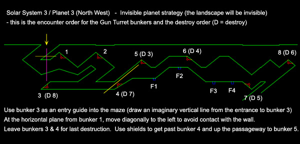 I've found a few keys to this North West planet - Invisible Landscapes are: **When you head for the entrance, make a bee line to it, as the 5th gun turret will still remain visible on the right edge of the screen -- this makes the trip up that diagonal part of the maze (towards the 5th turret) somewhat easier, as you are not floating around in total darkness. Finding the tunnel entrance is ONE MAJOR KEY to this planet - Draw an imaginary vertical line straight down to bunker #3 is THE KEY to finding the entrance (if you destroy the 3rd gun turret you encounter it makes finding the entrance very difficult if you need to re-enter the tunnel - so my advice is to leave it to the end).
